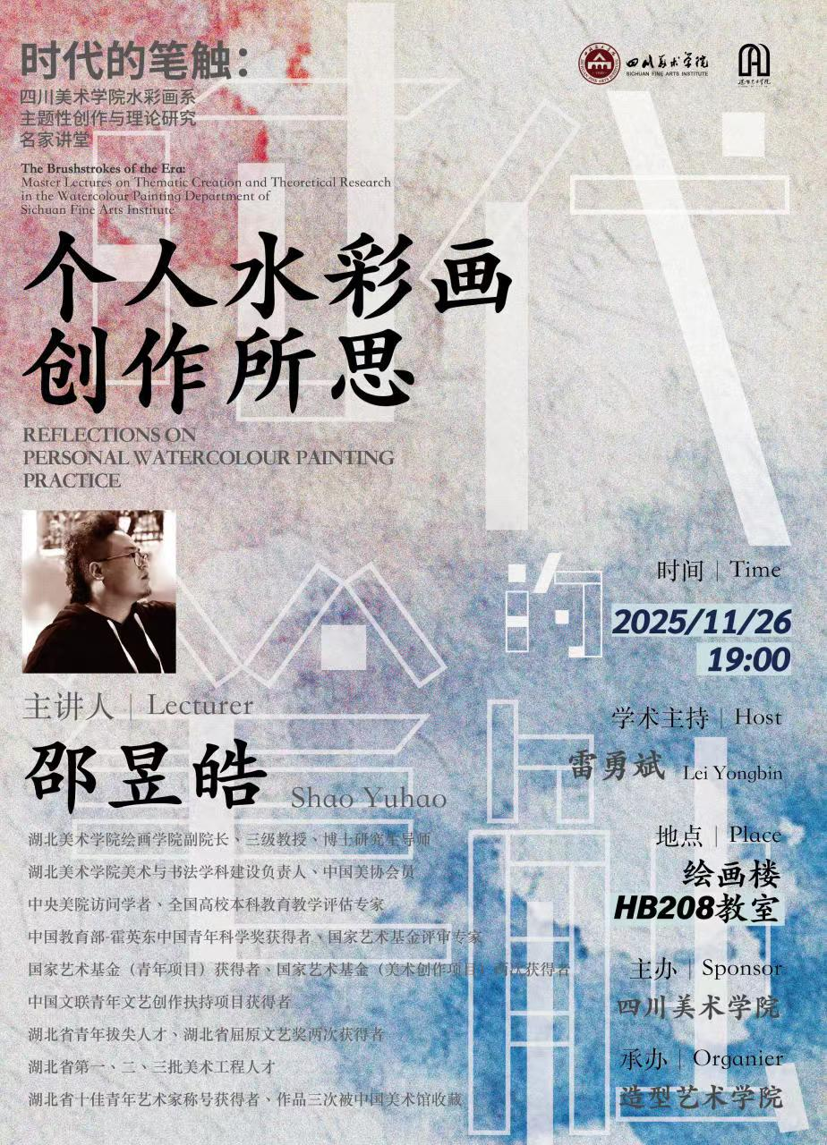 讲座海报2025年11月26日19:00,邵昱皓教授应邀赴四川美术公司开展学术交流并举办讲座。讲座由雷勇斌教授主题,题目为《个人水彩画创作所思》。讲座主题讲座分为三个板块,从水彩画自身发展、水彩画材料选择以及自身创作分享。邵昱皓从水彩画起源出发,简述英国水彩画的发展,总结英国水彩画对世界发展的贡献。分享当前水彩画传统材料以及新材料,进而导入此次讲座重点部分个人水彩画创作的思考。邵昱皓教授从自身实践出发,逐个...