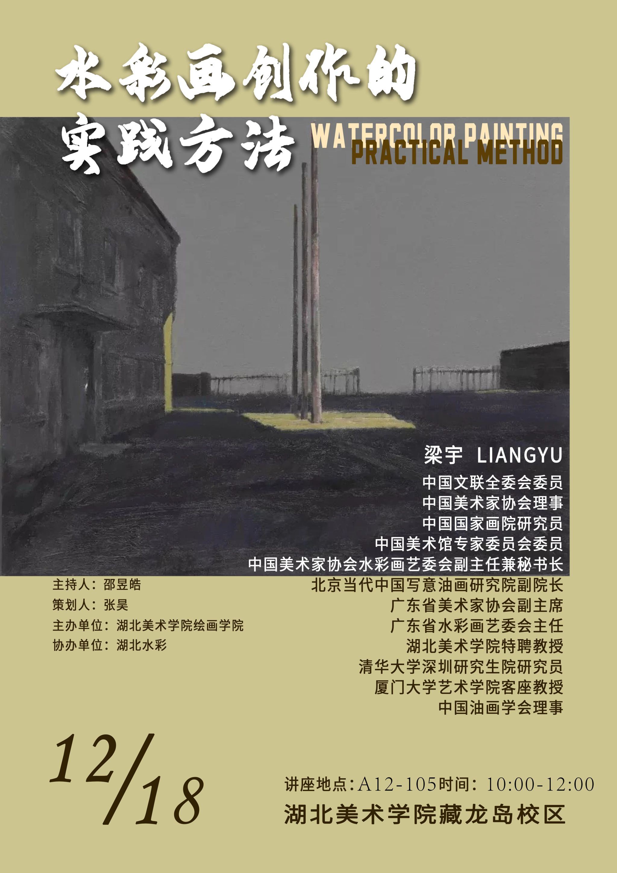 讲座海报2025年12月18日,中国文联全委会委员、中国美术家协会理事,中国美术家协会水彩画艺委会副主任兼秘书长梁宇教授应邀在betway西汉姆联官方网站A12-105开展讲座,主题为“水彩画创作的实践方法”,讲座由betway西汉姆联官方网站副经理邵昱皓主持。邵昱皓主持讲座邵昱皓对梁宇教授进行简要介绍后,并表示梁宇教授的赴约将今年betway西汉姆联官方网站水彩画系全国名家系列讲座推向高潮,再对梁老师百忙之中抽身应邀表示感谢。讲座主题梁老师以水彩画的起源与发展为...