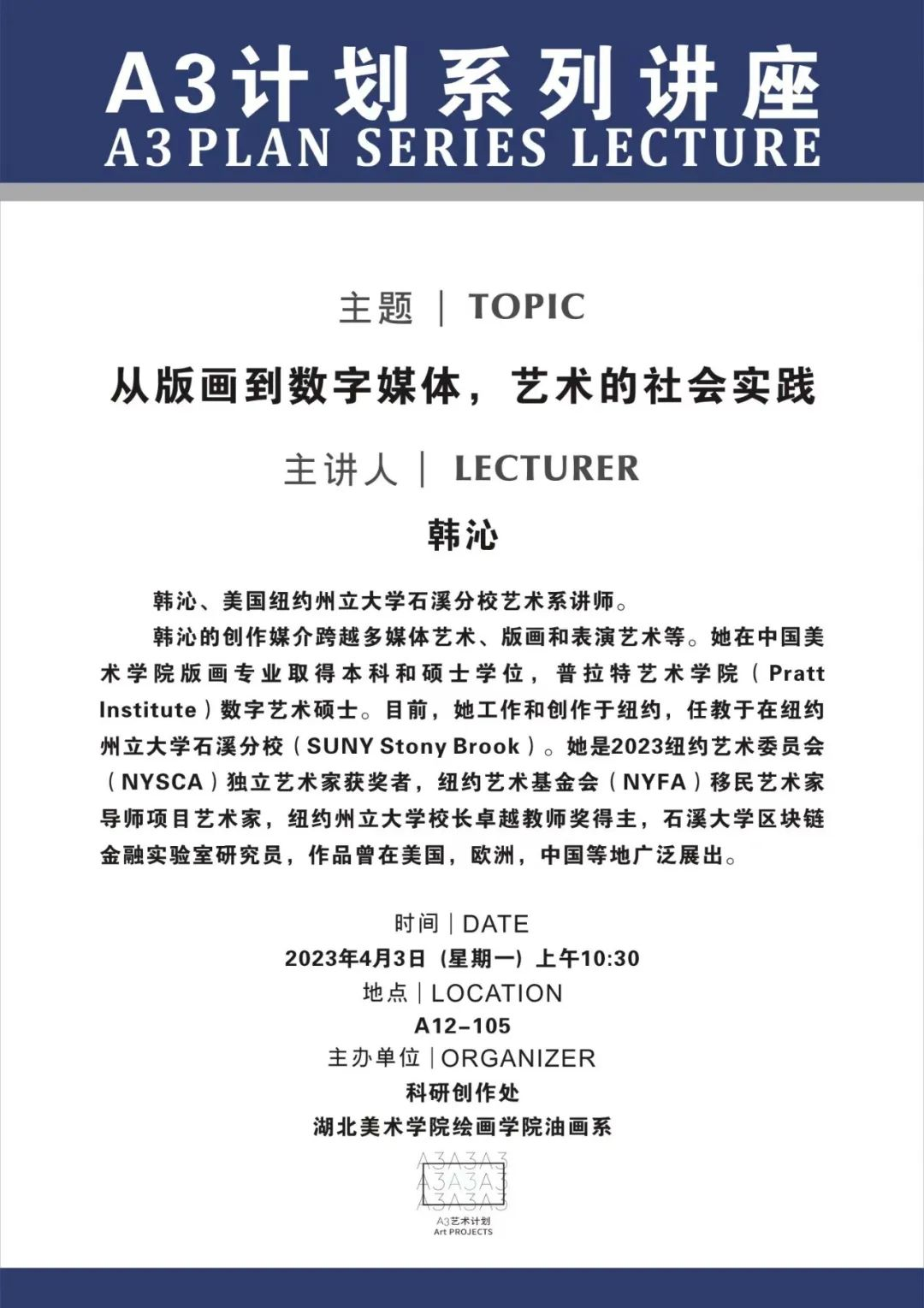 A3艺术与教学拓展计划(简称A3艺术计划),是集科研、创作、展示、教学为一体的项目。该计划由betway西汉姆联官方网站学术委员会主任、当代艺术家魏光庆教授发起,油画系主任徐文涛教授担任项目主持,以建立当代跨媒体视觉艺术研究及教学基地为目的,通过整合公司乃至国内外艺术与文化资源,逐步形成一个学术研究前沿、多功能、教研产衔接合理的区域视觉艺术中心