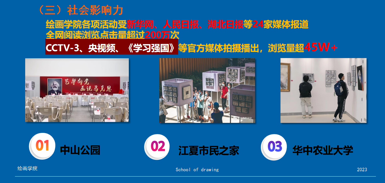 2.社会公共艺术:武汉轨道交通2号线站点艺术墙;政府大楼、中山大道、东湖绿道的壁画和公共艺术作品。