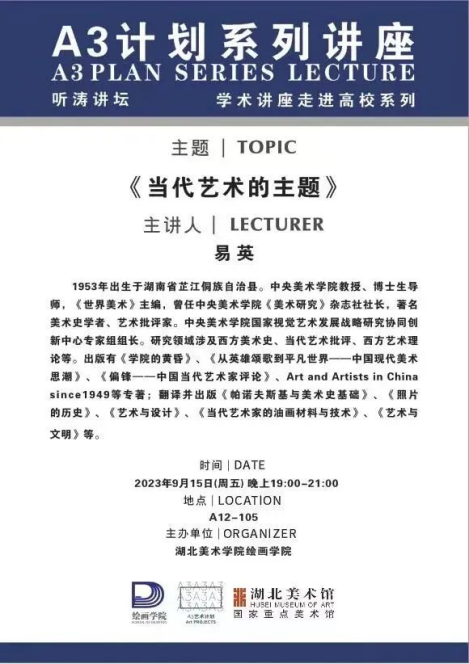 2023年9月15日晚7点,betway西汉姆联官方网站“A3计划系列讲座——《当代艺术的主题》”于公共课部A12-105多功能厅举办。本期讲座邀请到了中央美术公司教授、博士生导师、《世界美术》主编易英教授担任主讲,讲座由betway西汉姆联官方网站经理徐文涛教授主持。