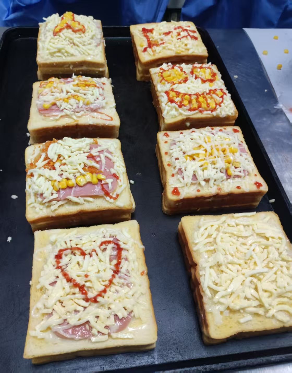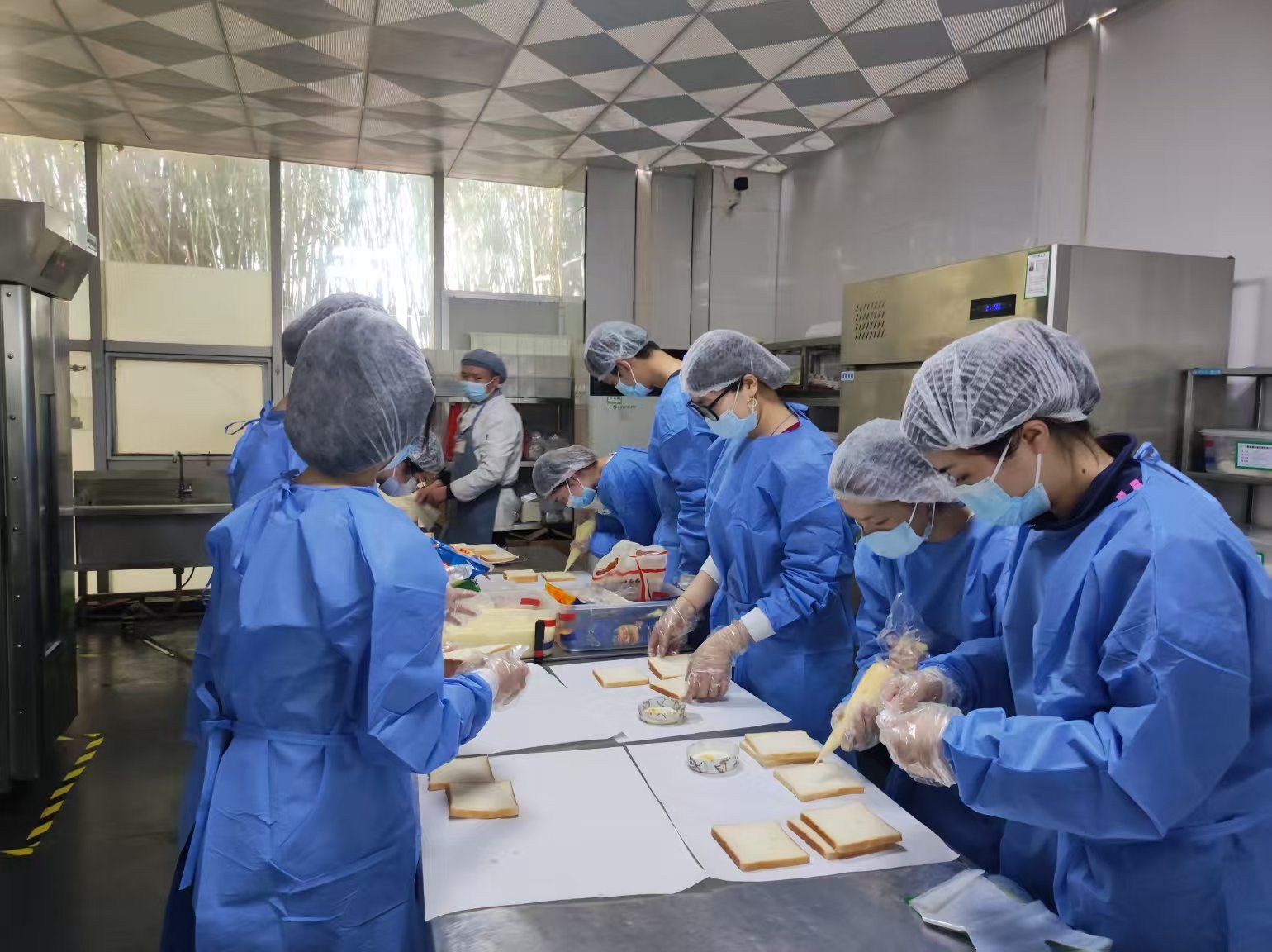 参观结束后,食堂面点师傅现场教学手作面包DIY。师生们化身"烘焙师",揉面、塑形、装饰,将艺术创意融入传统面点,制作出樱花造型、油画笔触等独具美院特色的面包作品。"没想到食堂师傅们的手艺这么精湛”。这种趣味互动让劳动教育与美育实现巧妙融合。
