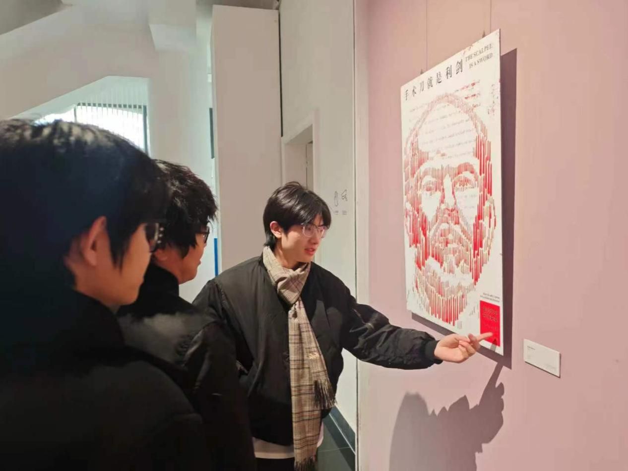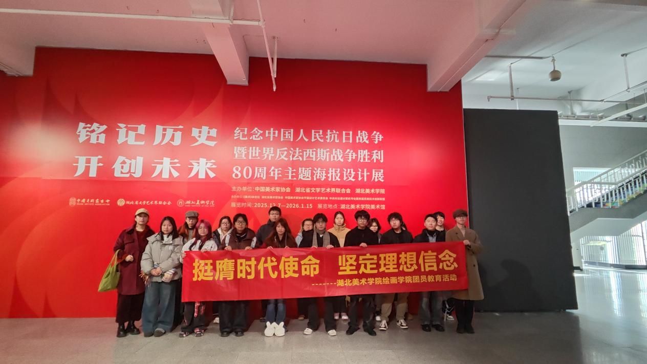 随后,团员们集体参观了正在展出的“纪念中国人民抗日战争暨世界反法西斯战争胜利80周年主题海报设计展”。展览汇聚了众多以抗战历史、民族精神、和平愿景为主题的海报设计作品,通过强烈的视觉语言和深刻的情感表达,生动再现了那段波澜壮阔的峥嵘岁月,弘扬了伟大的抗战精神。在一幅幅充满力量与感染力的作品前,团员们驻足凝视,深切感悟革命先辈为民族独立、人民解放所付出的巨大牺牲与不懈奋斗,深刻认识到今日和平与发展的来之不易。展览如同一堂生动的爱国主义教育课,激发了团员们强烈的历史使命感和社会责任感,坚定了他们传承红色基因、用艺术服务人民、描绘时代新篇章的决心。