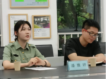 接下来,三位同学给大家分享入伍体验。潘雅婷给同学们分享之前当兵的经历,她作为卫生员从零基础开始学习卫生医疗知识,如心肺复苏、打针、输液、体检,现在仍然可以进行简单的急救,提升了自己的卫生急救知识。在新兵连中她经历丰富,如用真枪实弹进行打枪,学会与战友相处,人的身体素质、情感沟通能力都得到很大的提升。她也提醒大家在毕业那年参军入伍有提干机会,是不可多得的机遇。