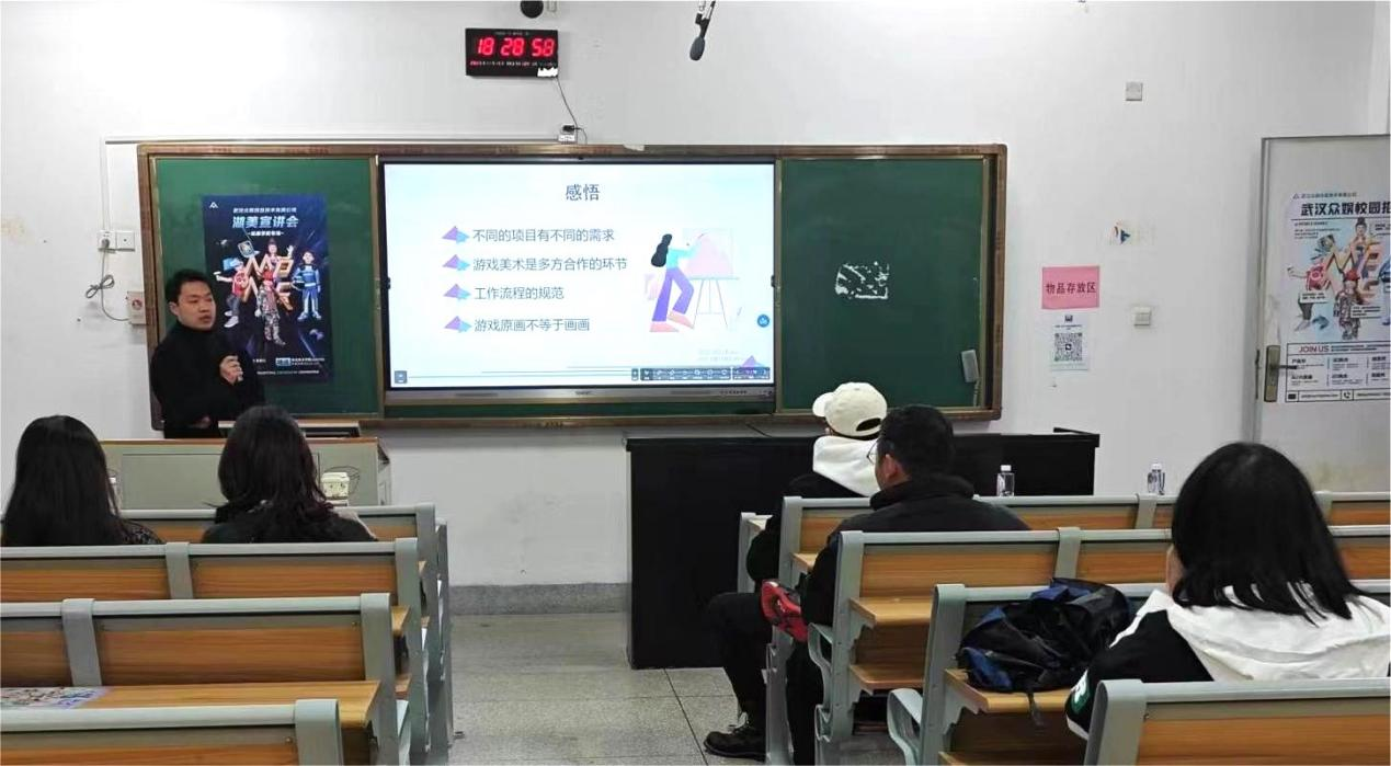 会上,武汉众娱信息技术有限公司相关负责人先后从企业概况、发展前景、用人需求、薪酬待遇等方面进行全方位宣讲,并用丰富的案例让同学们更加直观的了解各部门岗位的工作内容和职责。在交流答疑环节,同学们从职业发展前景、岗位要求、薪资待遇等方面与企业负责人进行了深入交流,现场气氛热烈。该公司提供原画设计师、3D场景设计师、游戏运营、平面设计师、行政专员等多个招聘岗位,部分毕业生现场填报就业意向。