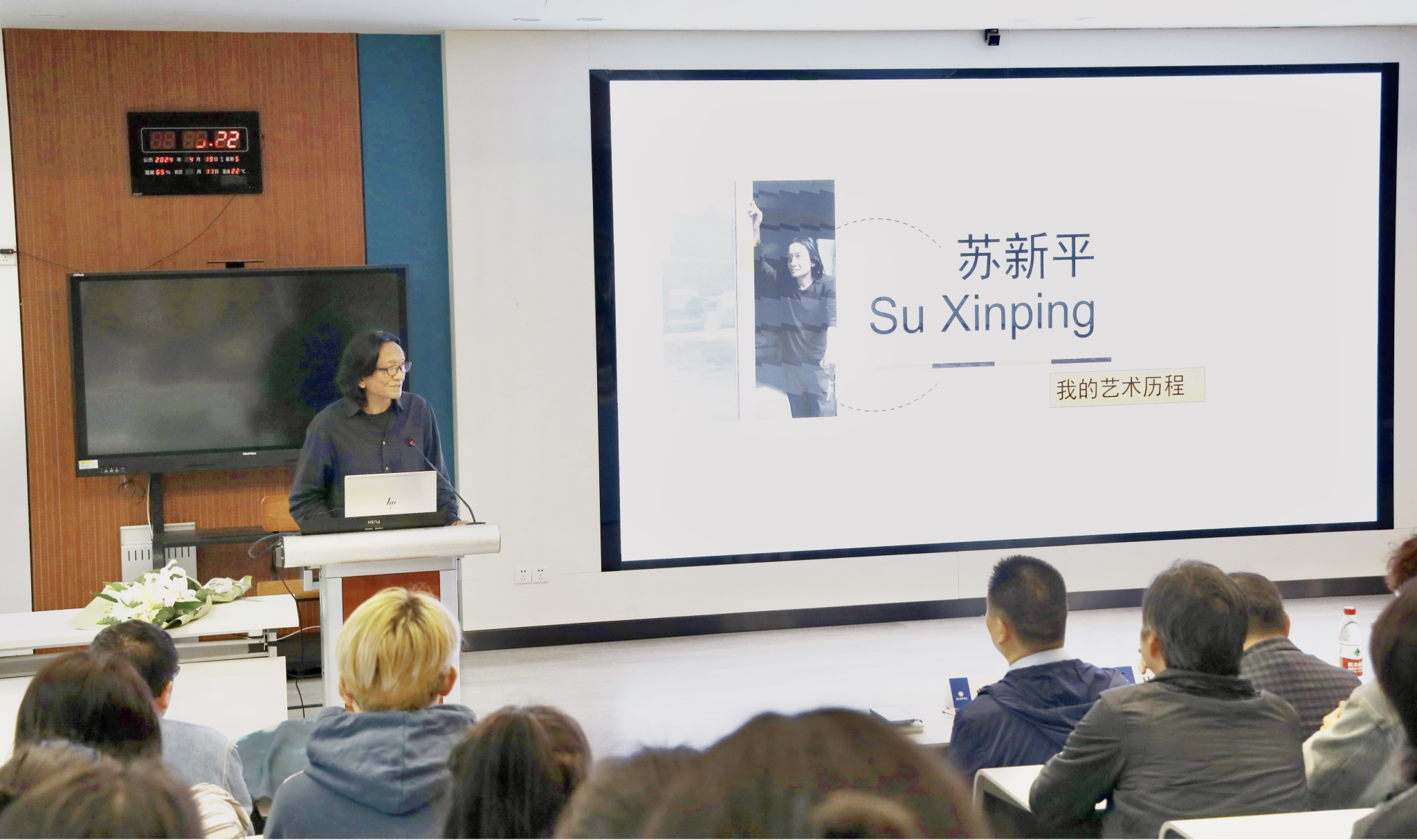 聘任仪式结束后,苏教授为在座师生展开了一场名为《我的艺术历程》的专题讲座。苏教授通过结合他的生活学习经历,将他的艺术思想通过几个方面向观众道来。苏教授首先谈到“认知现实”,即在创作中需要深入观察并感受现实世界,只有由微小转为宏大,作品才能具备真实感和深度;其次是“寻找自我”,在创作过程中,艺术家应勇于尝试,找到最适合自己的方式,敢于颠覆既有认知,大胆创新;最后就是“思想升华”,艺术并非仅仅是画笔下的产物,它首先源于内心的想法,是思想引领行为的体现,需对现实进行深入思考。创作,便是不断验证与升华这些思想的过程。