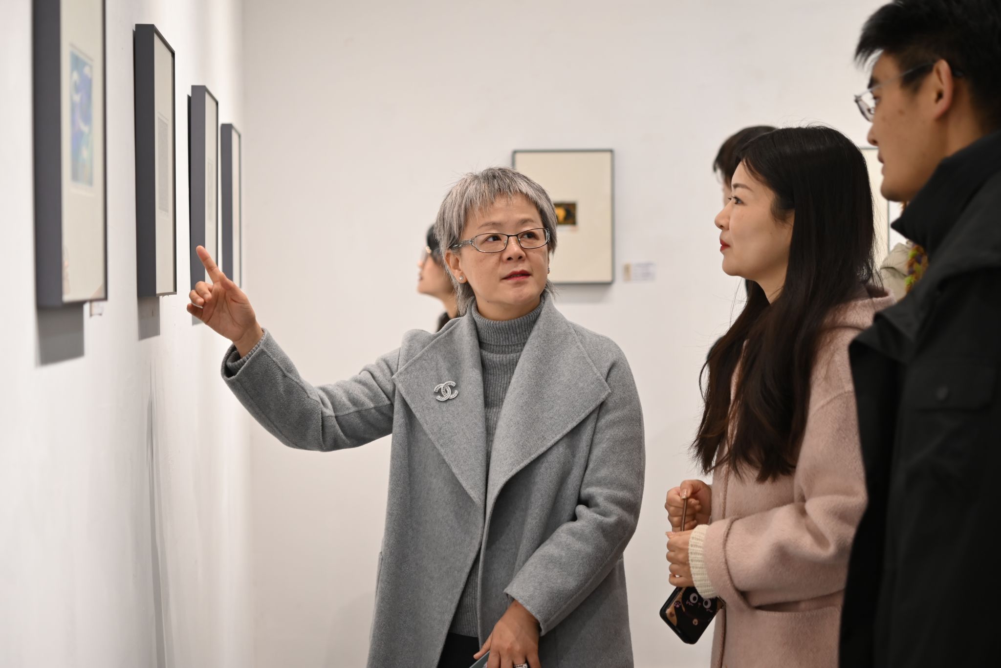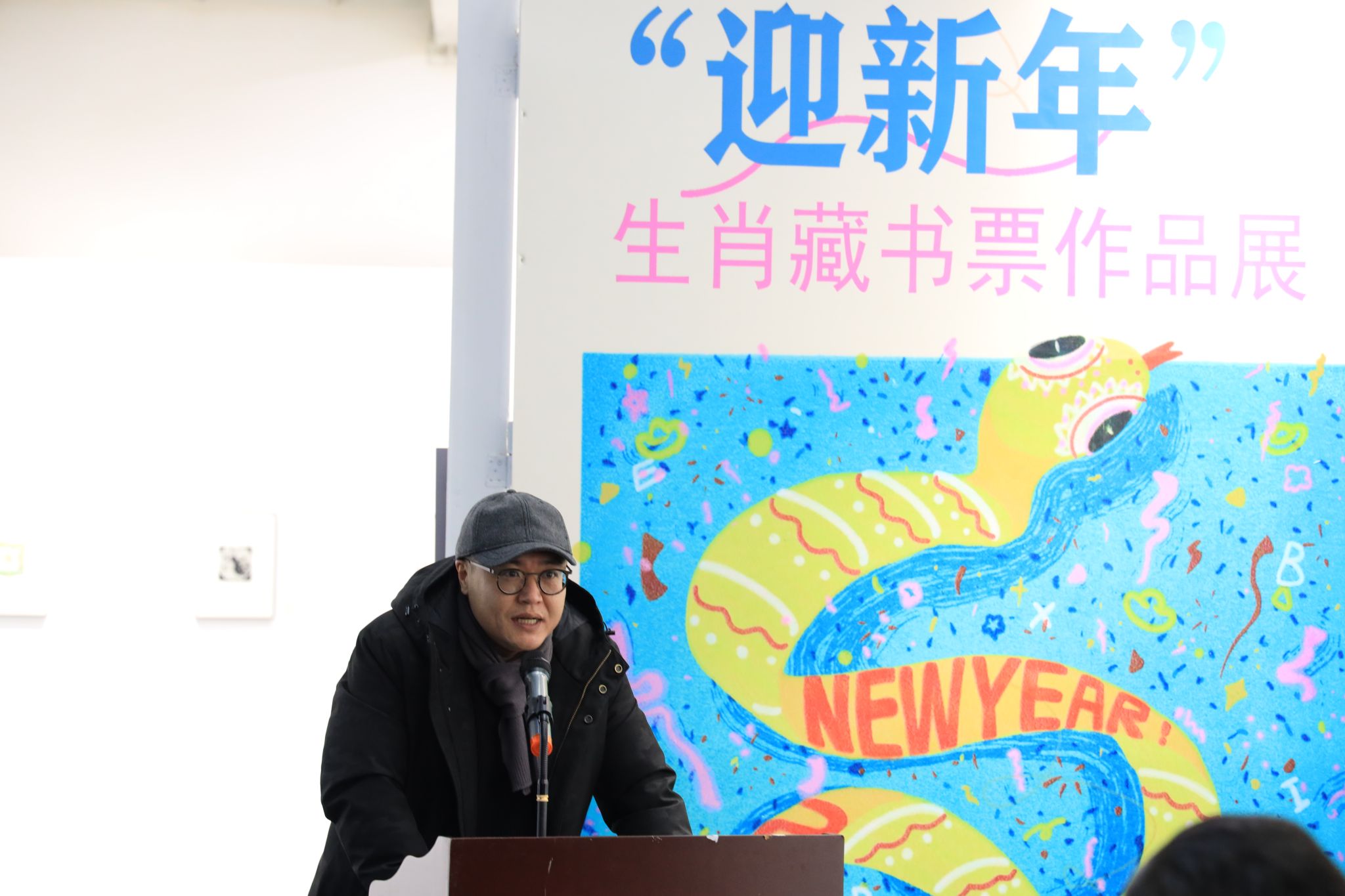 版画系教师顾秀华老师上台发言。生肖藏书票展是版画系自2021年发起并持续4年的展览,于每年元旦前夕举行。旨在将中华民族的生肖文化和文人墨客的藏书文化相结合,以交流生肖版画的形式,令大家集聚于此,迎接新春到来。