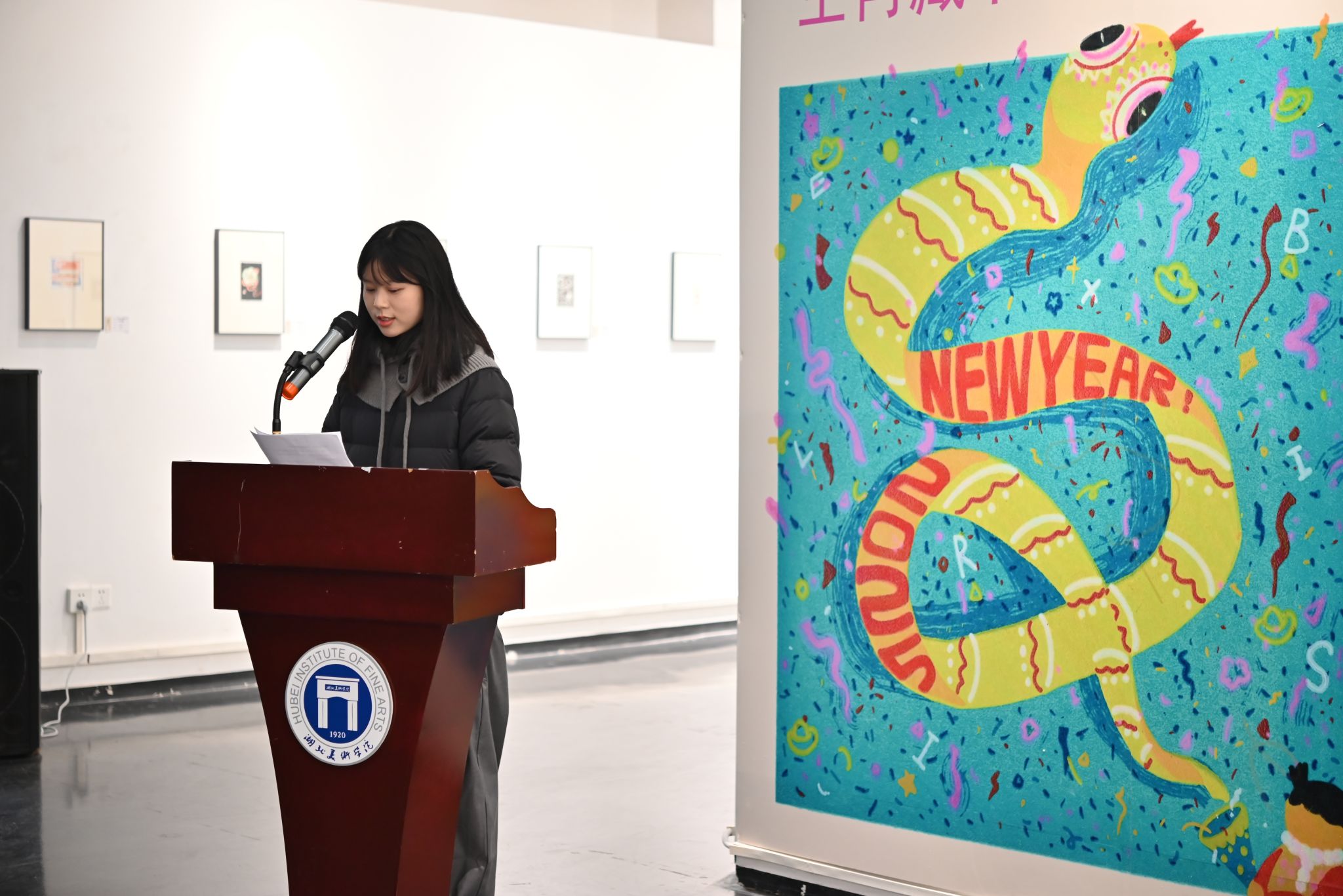 员工代表王丽雅发言。她代表版画系员工感谢betway西汉姆联官方网站为同学们的作品提供展示平台,吸引众多艺术爱好者与专业人士的关注与支持。通过这个展览,在收获了来自师生间宝贵交流的同时,也在与其他院校及艺术机构的互动中拓宽了视野,激发了新的灵感。每年的新年藏书票展览极大提升了同学们的创作积极性,使大家寓学于趣、交融并进。每一枚藏书票都承载着同学们的情感与思考,这份努力能够被看见、被认可,无疑是对同学们莫大的鼓励。