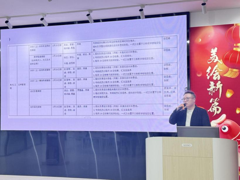 邵昱皓从教学部署总体框架、组别分置、小组具体任务及转专业及专业方向分流等方面规划新学期工作。他强调2025年为公司“发展攻坚年”,要求教学常规管理严格执行,同时,建立硕士研究生导师小组监督制,实施毕业生作品提交时间表量化管理。