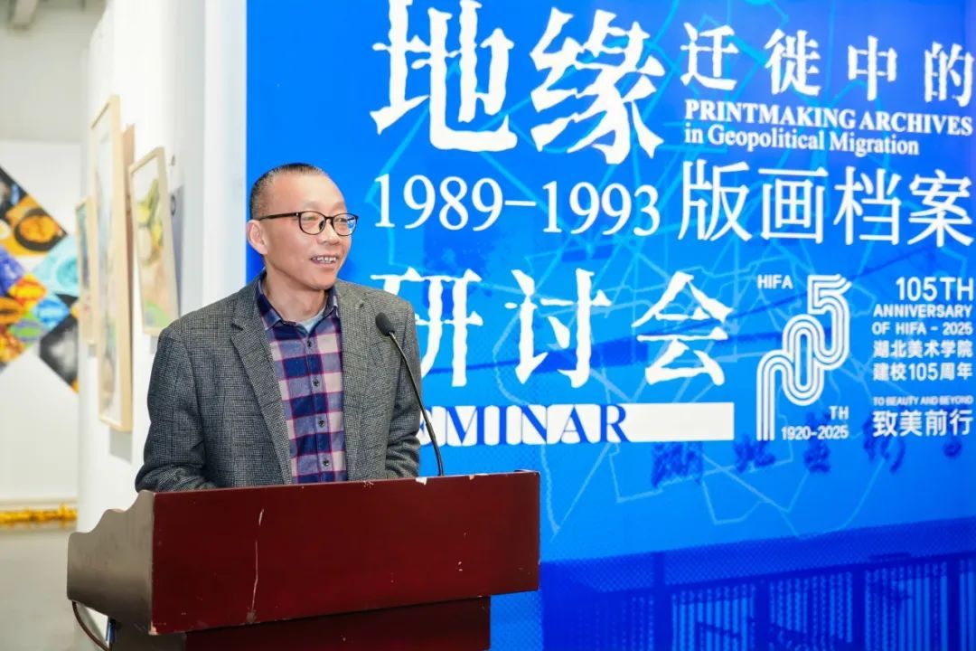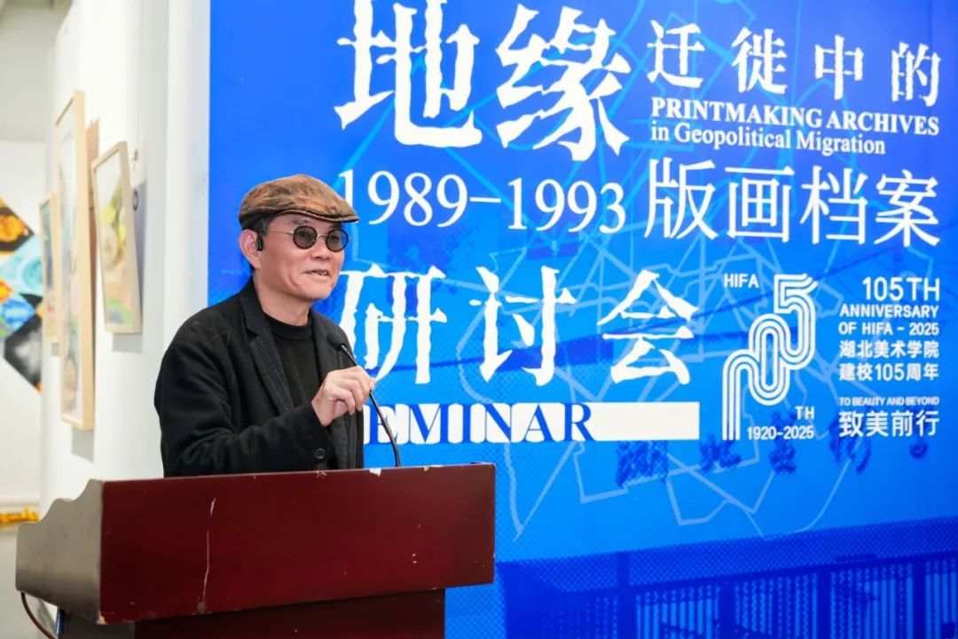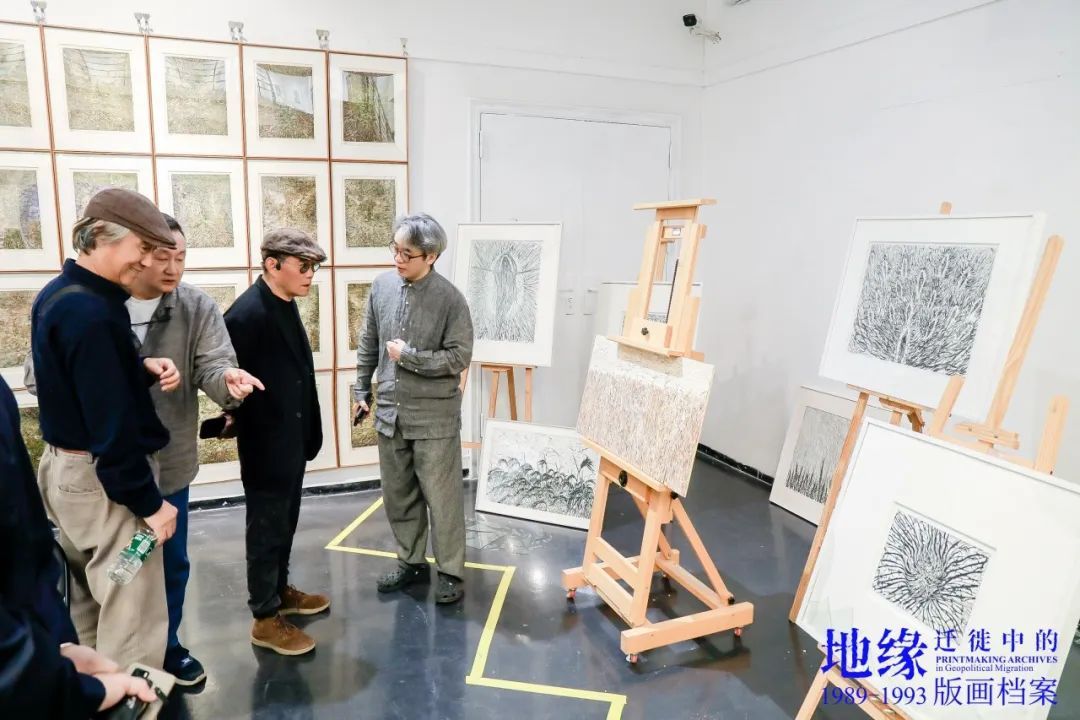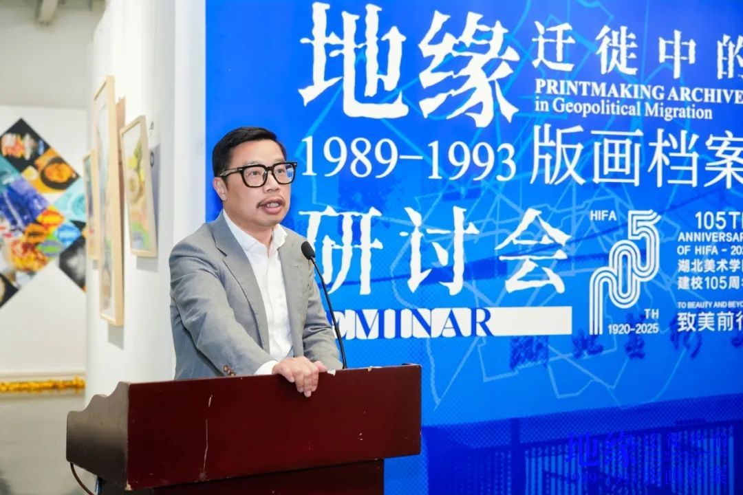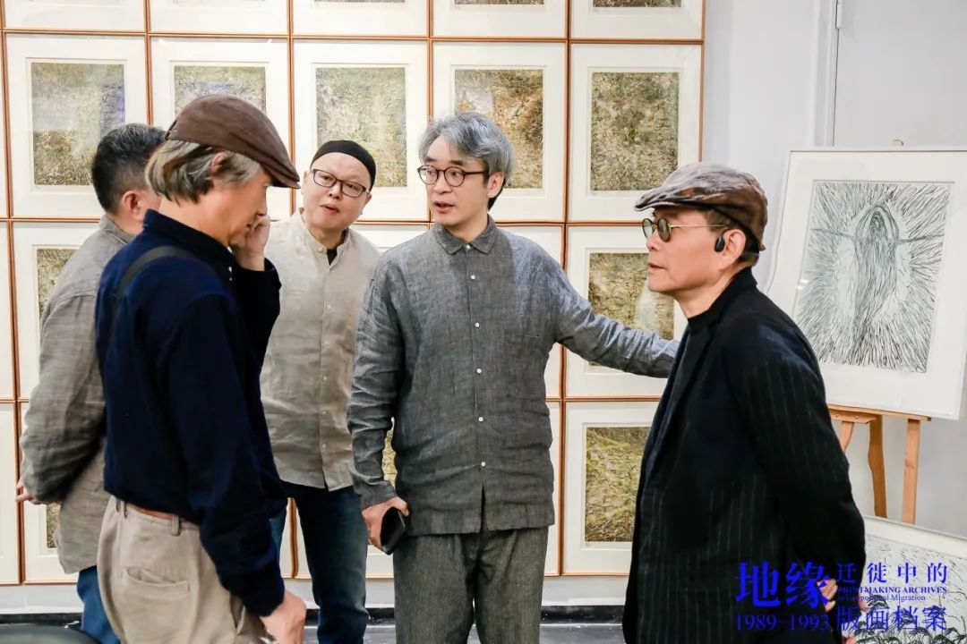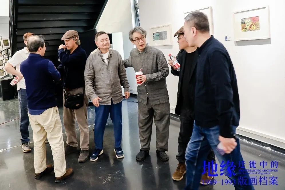 樊晖教授在致辞中谈到:回母校版画系做我们自己的展览意义特别,本次展览是2018年因一位学兄离世,我提议并发起,历经7年,去年又和一位学友告别,我们今天将展览在版画系艺术空间呈现,与现实生活悲喜交融一样,展览是地缘迁徙路线中鲜活的生态关系,1989级版画专业全体成员11人,以档案的个人叙事、地缘与迁徙的关联等多元特质,呈现给社会、母校、恩师和学弟们36年艺术生涯的姿态,以版画的物性、绘画性的丰富、以及文献边界的转化,继续未来艺术与生活的探索。