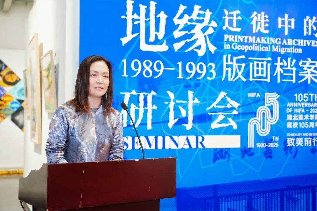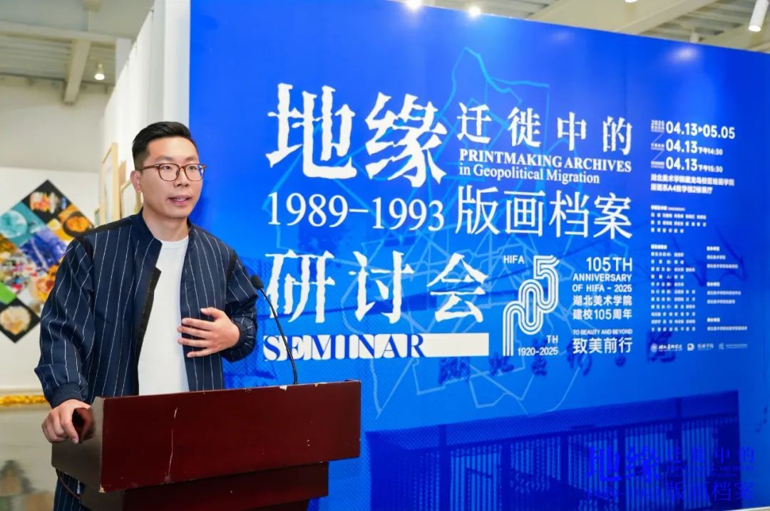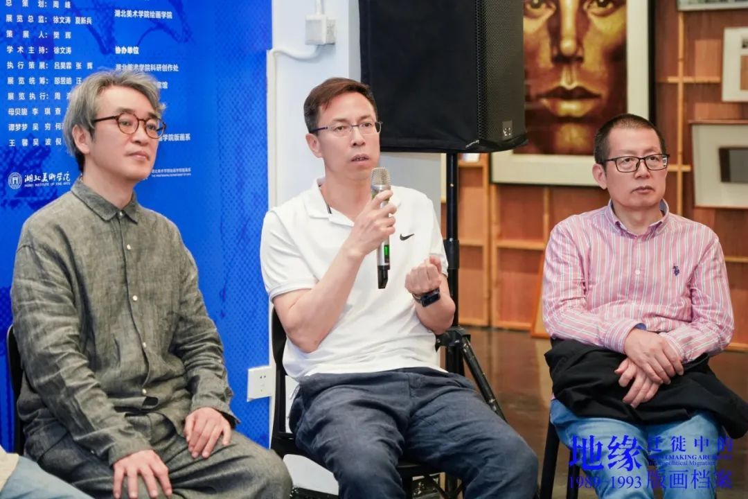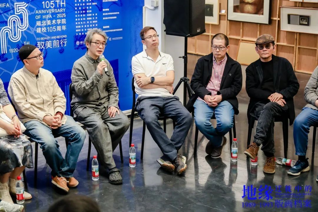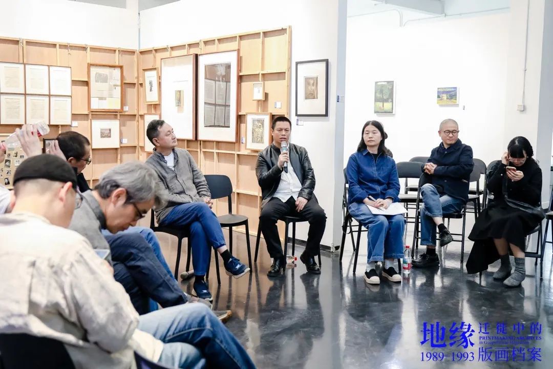 樊晖教授在致辞中谈到:回母校版画系做我们自己的展览意义特别,本次展览是2018年因一位学兄离世,我提议并发起,历经7年,去年又和一位学友告别,我们今天将展览在版画系艺术空间呈现,与现实生活悲喜交融一样,展览是地缘迁徙路线中鲜活的生态关系,1989级版画专业全体成员11人,以档案的个人叙事、地缘与迁徙的关联等多元特质,呈现给社会、母校、恩师和学弟们36年艺术生涯的姿态,以版画的物性、绘画性的丰富、以及文献边界的转化,继续未来艺术与生活的探索。