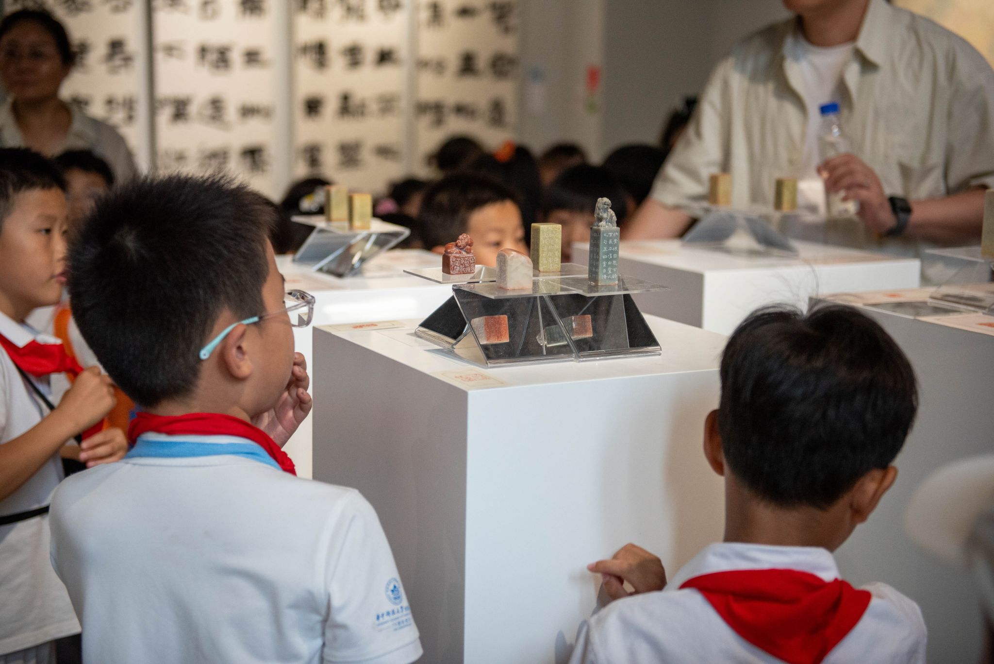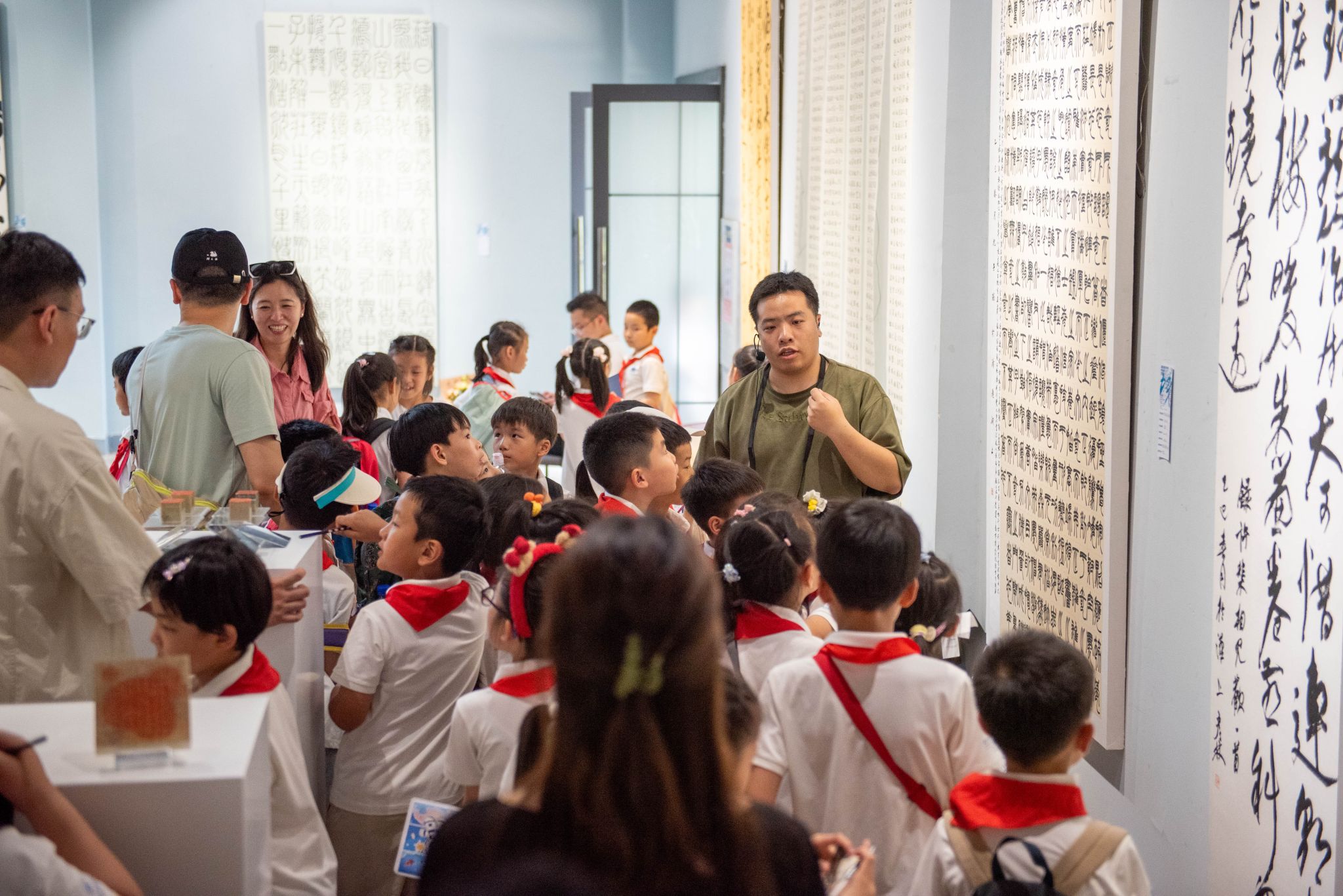 书法专业展区以“汉字基因”为脉络,呈现篆刻、现代书法装置等作品。中国画公司教师安墨韬讲解篆书与草书的笔法差异:“草书之妙,在于‘无形而有象’,每个线条都是情感的流动轨迹。”从魏晋书法的艺术性觉醒到清代篆书的复古意趣,孩子们在文字演变中触摸到中华文脉的厚度。