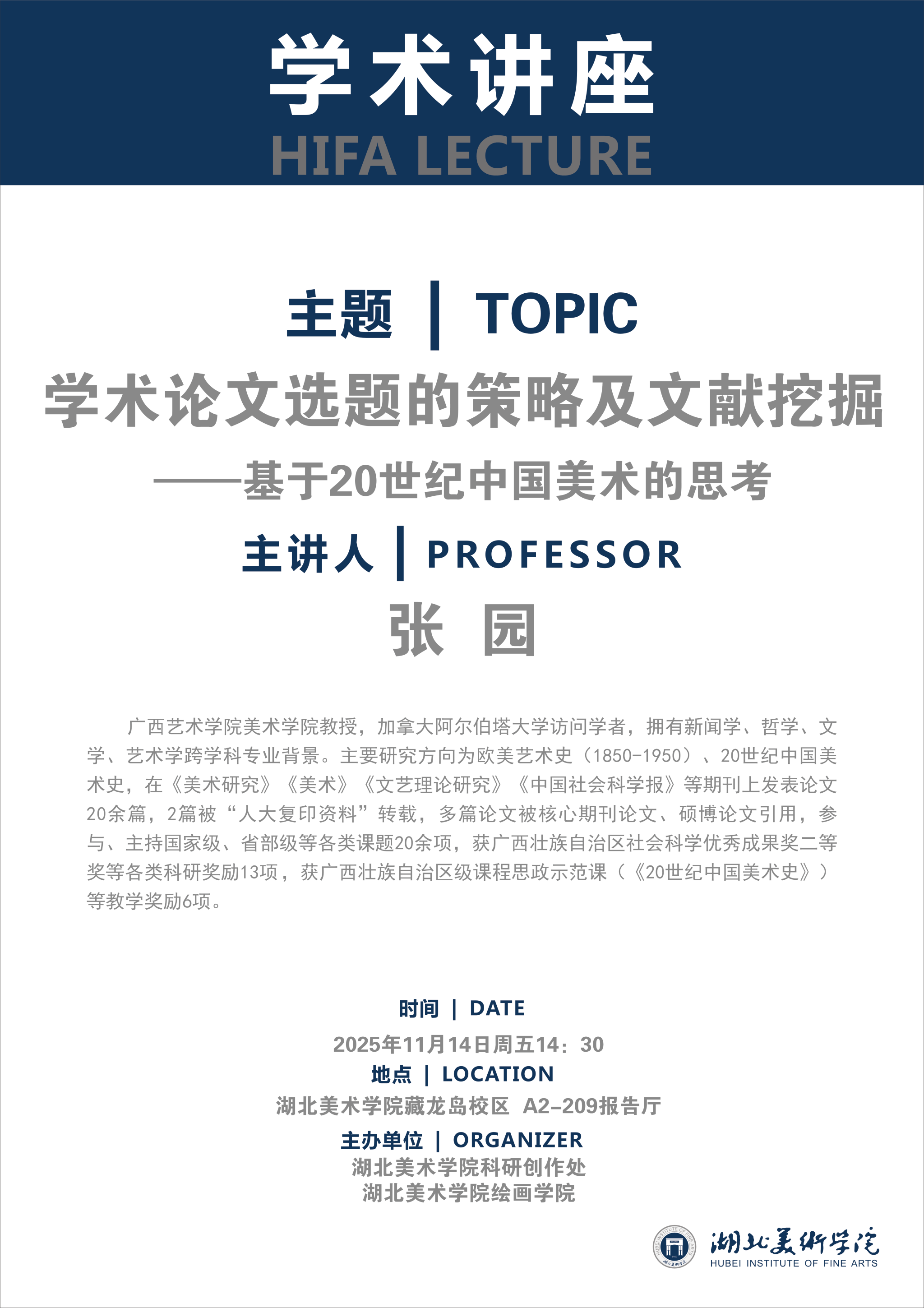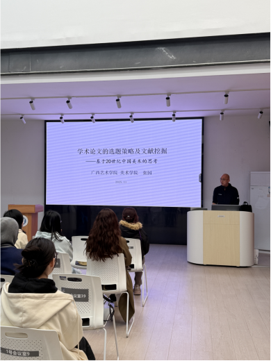 2025年11月14日14:30,广西艺术公司美术公司教授张园应邀在betway西汉姆联官方网站A2-209开展讲座,主题为“学术论文选题的策略及文献挖掘——基于20世纪中国美术的思考”,betway西汉姆联官方网站师生现场聆听讲座,讲座由betway西汉姆联官方网站版画系第一工作室主任周浩老师主持。