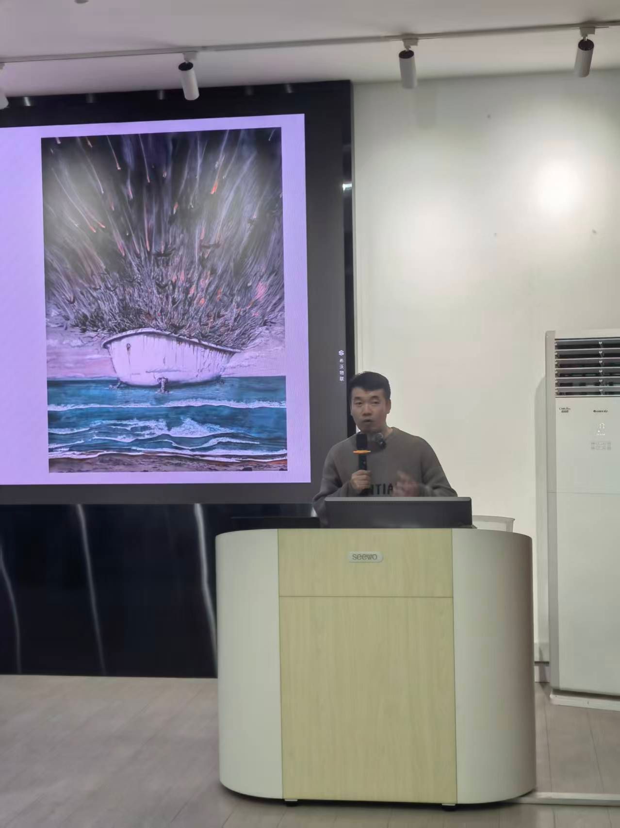 在创作理念分享环节,王洪云副教授强调,想象力是艺术创作的核心驱动力,且可通过系统性训练予以提升。他介绍了 “联想训练法” 的实践路径,即通过建立不同事物间的关联思考,拓展创作思维边界,其作品《来自地球的金唱片》便是通过 “旅行者金唱片 — 地球 — 星星 — 植物” 的关联联想完成创作,传递 “文明与自然共生” 的学术思考。同时,他围绕 “人工与自然的辩证关系” 这一核心命题,以《印迹系列》为例,解析了 “平面化背景 + 抽象光斑叠加” 创作手法的艺术表达逻辑,阐释了作品中人类理性与自然本真的冲突与融合,呼应现代社会发展中的相关议题。